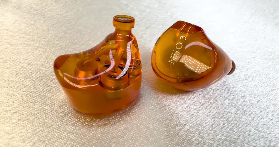 The Neo3s’ distinctively orange medical-grade resin shells are fully vented & decently large, which is explained by their driver configuration – all three drivers in each earpiece are quite chunky, and you can see them clearly through the resin.